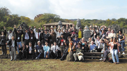 AJF 행사 나흘째인 3일 제주도 돌박물관에 들른 참석자들이 박물관을 둘러본 후 제주도의 토속상징물인 돌하르방 앞에서 기념사진을 찍고 있다.