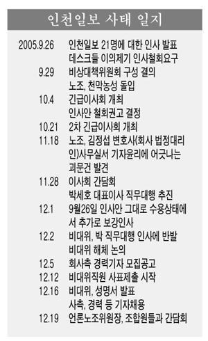 이에 앞서 비대위는 16일 ‘인천일보를 떠나며’란 성명서를 통해 “인천지역 취재현장을 누비며 정론을 펴려 애써 온 기자 32명이 독자 여러분의 성원에 부응치 못하고 떠나게 됐다”며 “회사측의 부당한 처사에 대해서는 단호한 법적 조치를 취해 갈 것”이라고 말했다.