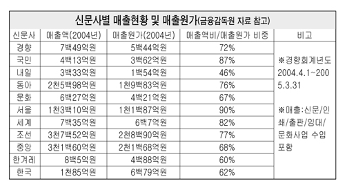 업계 관계자들은 “현재 한 달 신문구독료는 커피 두, 세잔 값과 비슷하다”며 “일요일 빼고 약 26일간 매일 32~64면씩 배달되는 신문의 가격은 터무니없이 낮은 것”이라고 말하고 있다. 본보가 11개사의 2004년도 금융감독원 감사보고서를 분석한 결과, 매출액 대비 매출원가는 평균 71%로 나타났다.
