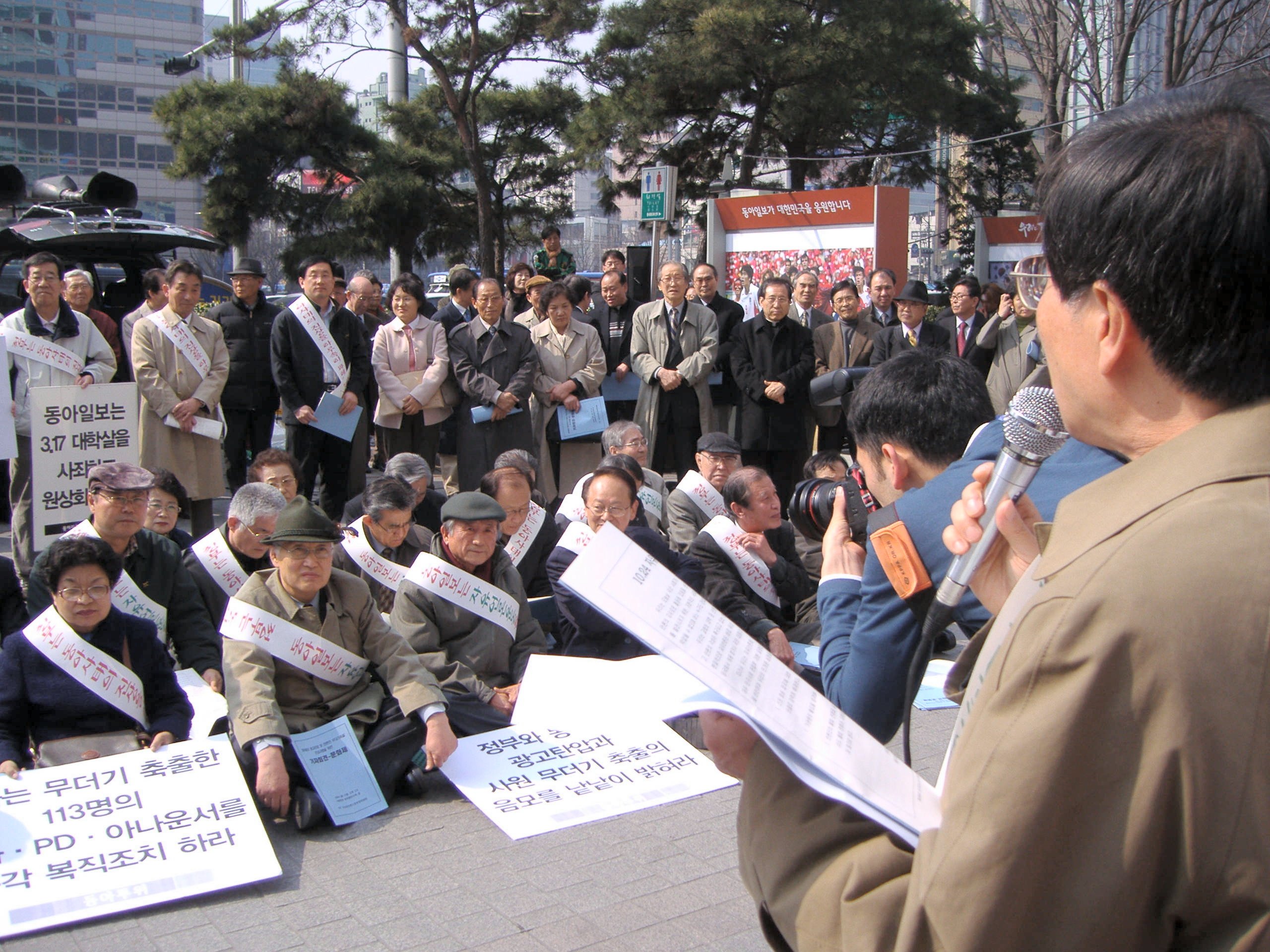 17일 동아 사옥앞에서 열린 '동아일보 광고탄압 및 언론인 무더기 축출' 진상규명을 위한 기자회견-문화제에서 백발의 참석자들이 사회자의 진행내용을 경청하고 있다.