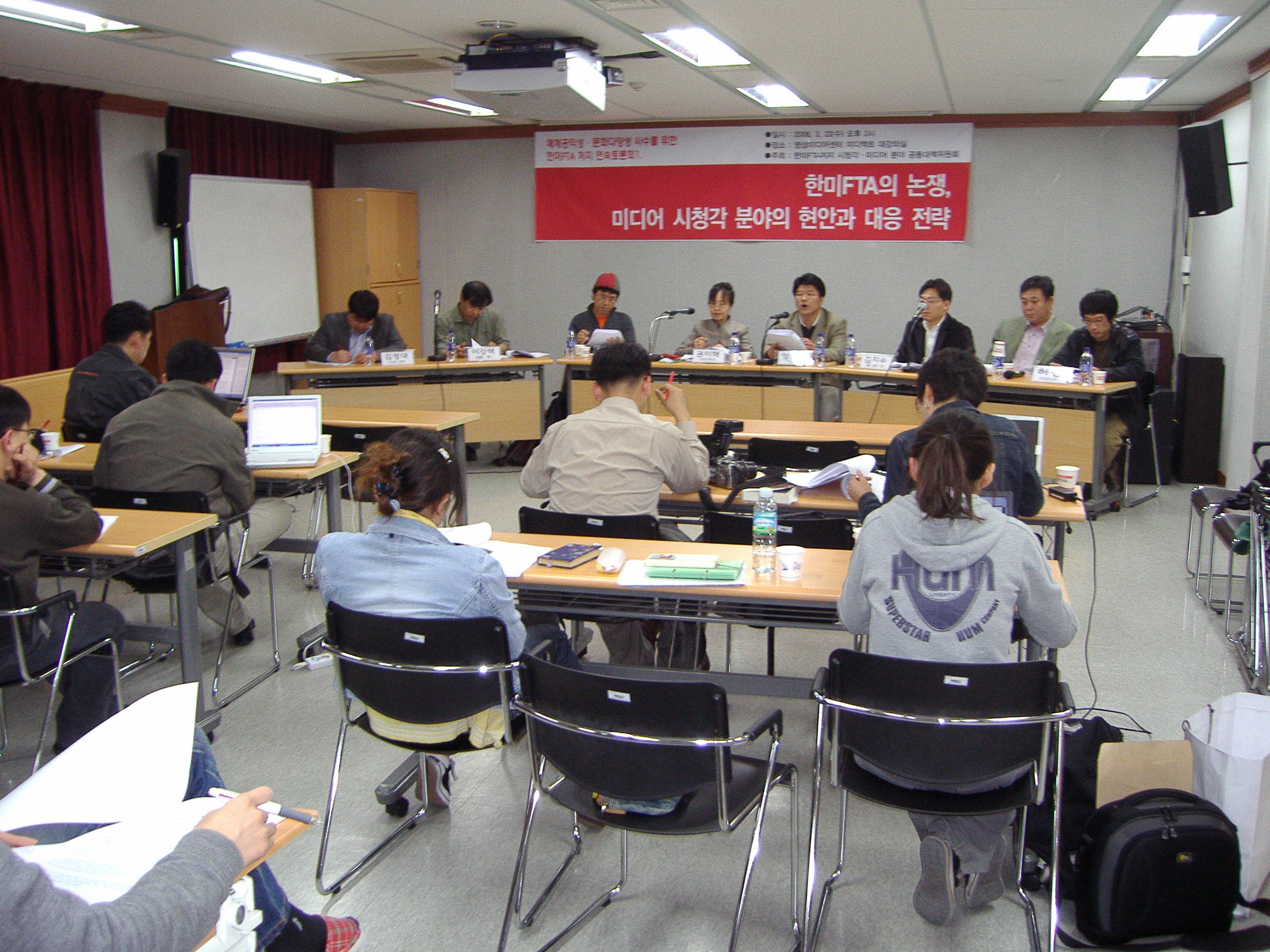 한미FTA 시청각.미디어분야 공동대책위원회는 22일 오후 2시 미디액트 대강의실에서 ‘한미FTA 미디어 시청각 분야의 현안과 대응 전략’이란 주제로 토론회를 개최했다. 이날 토론회에서는 양문석 언개련 전문위원이 ‘한미FTA를 통한 미국의 방송장악 노림수 분석’, 전규찬 문화연대 미디어문화센터 소장이 ‘FTA와 시청각 문제, 미디어 연대운동의 구성’을 주제로 각각 발제했다.