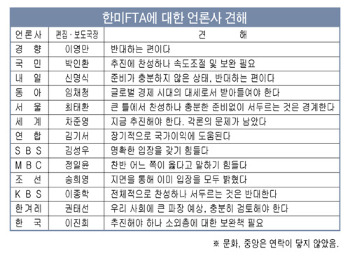 국민, 서울, KBS, 한국 등 4개사는 한미FTA의 추진 자체는 긍정적이나 좀 더 치밀한 준비와 신중한 태도가 필요하다고 단서를 달았으며 경향·내일·한겨레는 비판적인 입장에 무게를 뒀다.