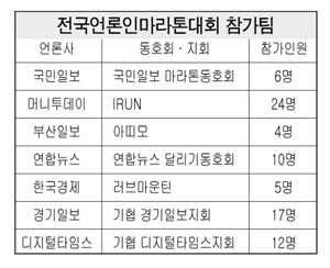 현재까지 단체참가를 신청한 언론사 마라톤 동호회는 머니투데이 ‘IRUN’, 연합뉴스 ‘연합뉴스 달리기 동호회’, 국민일보 ‘국민일보 마라톤동호회’, 부산일보 ‘아띠모’, 한국경제 ‘러브마운틴’ 등 5개 사이며 경기일보와 디지털타임스는 기자협회 지회를 중심으로 참가한다.