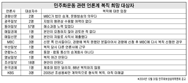 민주화보상심의위원회는 지난 2004년 12월 28일 동아, 조선을 비롯해 경향신문, 광주일보, 매일경제, 매일신문, 문화방송(MBC), 부산일보, 연합뉴스, 영남일보, 한국경제, 한국방송(KBS) 등 12개사에 총 94명의 해직 언론인에 대한 복직을 권고했다.<표 참조>