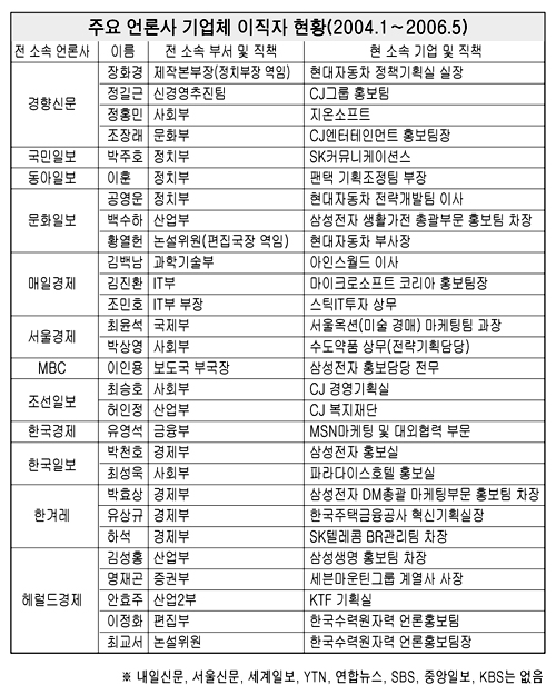 기업체로 이직한 기자들에게는 곱지 않은 시선도 따른다. 기자 출신들이 기업체에서 주로 진출하는 분야는 홍보파트. 그곳에서 주로 자사에 불리한 기사 막기 등 ‘대 언론 로비 활동’을 벌인다는 것이다. 자신이 담당하던 출입처에 취업하는 경우도 도마에 오른다. 그러나 현업에 있는 기자 출신 기업 홍보 담당자들은 적극적으로 반박한다.