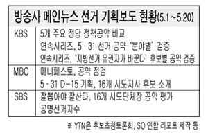 본보가 KBS, MBC, SBS 등의 저녁 메인 뉴스를 5월 1일부터 20일까지 분석한 결과 방송의 제한된 시간적 환경을 반영하듯 시민단체의 입을 빌은 공약 검증과 후보 소개, 접전지 등 비슷한 보도 양상을 보였다.