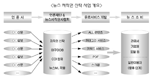 뉴스저작권신탁 사업이 문화관광부의 공식 허가를 받음에 따라 온라인 뉴스 유통 구조의 재편 작업이 시작됐다. 언론재단과 사업에 직접 참여하는 언론사들의 조직인 뉴스저작권자협회가 유기적으로 결합해 진행하는 이번 사업은 불법 뉴스 유통 시장 체계화를 통한 수익 창출이 목표다. 궁극적으로는 온라인상의 뉴스 유료화를 지향하고 있으며 뉴스 저작권에 대한 인식 확산을 기대하고 있다. 뉴스저작권신탁 사업은 세부적으로 ‘아쿠아DB 프로젝트’ 사업과 콘텐츠 식별 체계 COI(Content Object Identifier), 뉴스 전송 표준화(뉴스 ML) 등이 복잡하게 결합돼 있다. 뉴스저작권신탁 사업의 성공 여부는 얼마나 많은 언론사가 참여하느냐와 언론사가 새로운 콘텐츠 제작에 어떤 인식을 갖느냐에 있는 만큼 보는 시각도 다양해 귀추가 주목되고 있다.