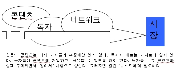 그것이 UCC라는 흐름으로, 시민기자라는 양태로 이미 기존 언론을 위협하고 있다. UCC를 생산적으로, 산업적으로 활용하려는 다양한 시도들이 미디어 기업 내부에서 일어나고 있지만, 권위적이고 폐쇄적인 신문기업은 아직 주저하고 있다.