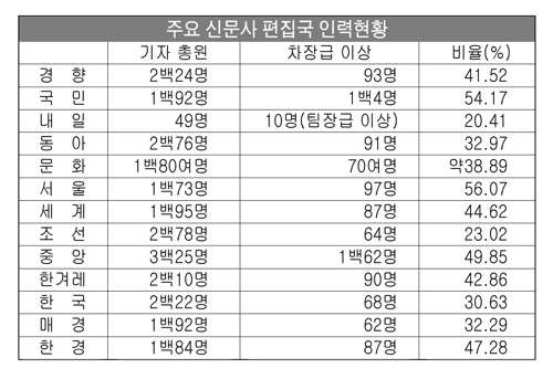 뿐만 아니라 국민(54.17%)도 전체 편집국 인력 중 절반 이상이 간부였으며 중앙(49.85%) 한경(47.28%) 세계(44.62%) 한겨레(42.86%) 경향(41.52%) 등도 과반에 가까운 수치를 보였다.