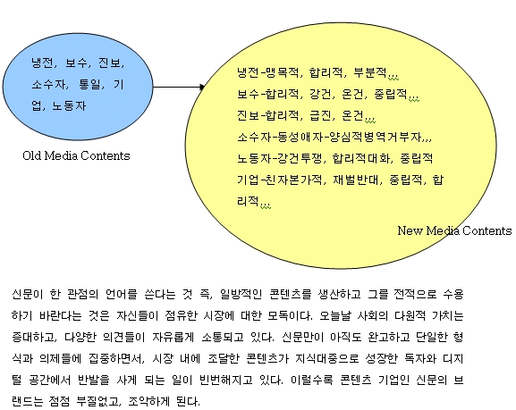 이러한 신문 콘텐츠의 한계는 신문을 만드는 저널리스트의 창조력이 바닥났기 때문이다. 신문이 브랜드의 관행과 관점, 관성을 벗어나지 않는한 뉴미디어는 품으로 들어오지 않는다. 영리한 독자들은 서서히 신문과의 관계를 스스로 결정하고 있다.