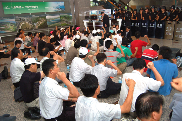 | ▲ 세계평화통일가정연합 회원 3백여명이 '신동아' 9월호의 '대해부 통일교 왕국' 기사에 항의하며 22일 동아일보 충정로 사옥 로비를 점거, 농성을 벌이고 있다. | ||
