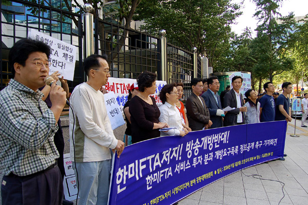 앞서 열린 기자회견에서 공대위는 “미국과 한국정부가 교환한 개방요구목록에서 미국은 ‘방송과 기간 통신분야에 대한 외국투자 제한 완화’까지 주장하고 있다”며 “정보가 막혀 있는 상황에서 케이블TV와 위성방송사업자에 대한 외국인 투자제한 폭이 49%와 33%인 것을 감안한다면 미국의 개방요구압력은 지상파방송에 맞춰진 것”이라고 주장했다.
