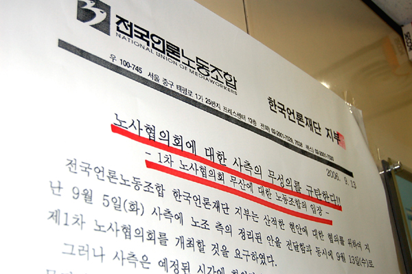 지난 7월 출범한 언론재단 노동조합은 13일 제1차 노사협의회를 개최할 것을 사측에 요구했다. 그러나 이날 임원진은 노사협의회 회의장에 나타나지 않았고 노조는 회의 무산을 선언, 회의가 결렬됐다.