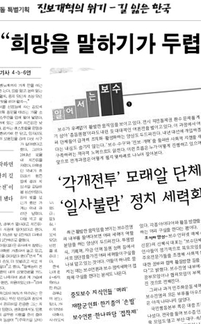 경향은 창간 60주년 특별기획으로 ‘진보개혁의 위기’를 주제로 14일부터 게재했다. ‘희망을 말하기가 두렵다’는 머리기사로 특별기획의 제1부 ‘길 잃은 한국’을 시작한 경향은 진보개혁이라는 이름으로 권력이 된 진보세력이 서민층의 희망을 앗아가고 사회를 양극화한 원인으로 꼬집었다.