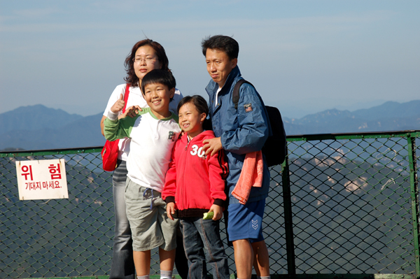 “정상이다” 문장대 정상에 도착한 한 가족이 기념촬영을 하고 있다.