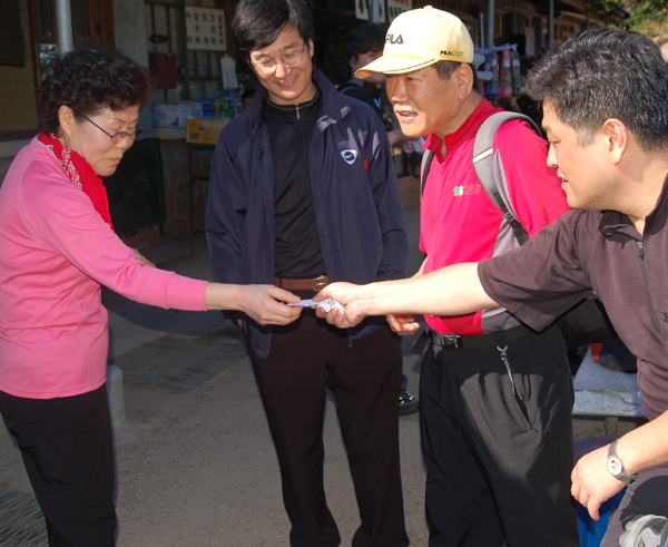 문장대에 오른 회원 가족이 진행요원으로부터 완주증을 받으며 즐거워 하고 있다.