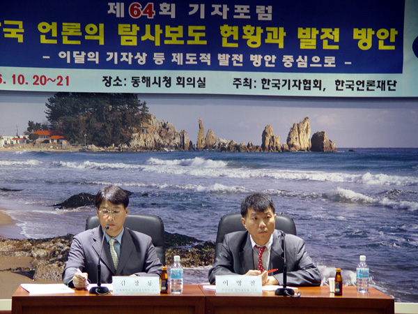 기자협회가 20일 강원도 동해시청에서 '한국언론의 탐사보도 현황과 발전방안'이라는 주제로 언론재단과 공동으로 주최한 제64회 기자포럼에서 발제를 맡은 김창룡 인제대교수는 "현재 탐사보도 취재기법은 주로 기획기사부문에 반영되고 있다"며 "기자상 후보작의 일부를 탐사보도부문으로 분리해 늘어나고 있는 기자상 후보작의 일부를 탐사보도부문으로 유도, 소화시켜야 한다"고 말했다.