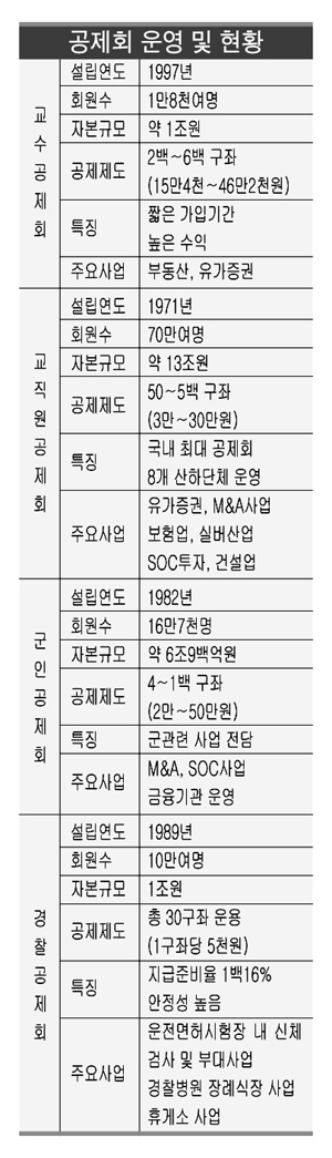 이에 본보는 1997년 회원 1천2백명, 자산규모 3백억원으로 시작해 9년만에 회원 1만8천명, 자산규모 1조원을 바라보는 전국교수공제회를 비롯해 여타 공제회의 운영 및 실태를 조사, 언론인공제회의 필요성과 방향을 모색코자 한다.