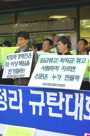 노조 비대위(위원장 신학림)는 지난달 30일 오후 2시 한국일보 사옥 앞에서 ‘‘껍데기’ 분사 및 일방적 인원정리 계획 규탄 기자회견’(사진)을 열고 “장 씨 일가를 감옥에 보내지 않고서는 떠날 수 없다”며 사측의 분사 방안과 인원정리 계획에 대해 ‘장 회장 퇴진 운동’까지 고려하고 있다.