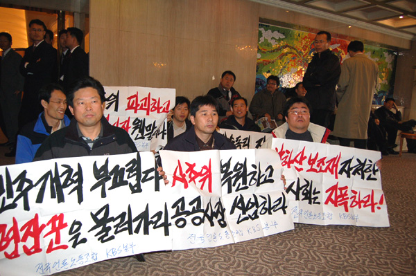 KBS노조원 20여명이 이사회 퇴진을 요구하며 시위를 벌이고 있다. |