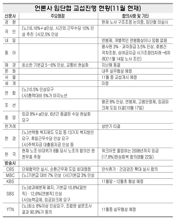 언론사들의 임금협상과 단체협약이 각 사별로 진행되고 있다. 조선과 동아는 이미 타결된 반면 대부분의 언론사는 노사 양측이 임금인상폭과 각종 복지제도 도입 등을 놓고 팽팽한 줄다리기를 하고 있다.