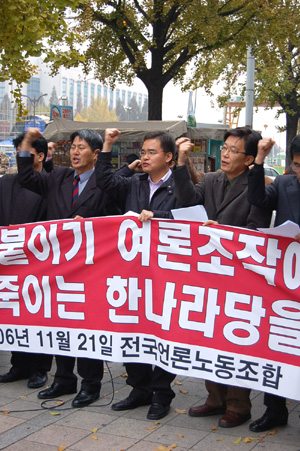 언론노조는 21일 오전 여의도 국회 국민은행 앞에서 ‘한미FTA 밀어붙이기 여론조작에 분노한다’는 기자회견을 열고 이같은 문건을 공개했다.