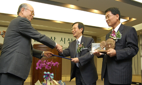 | 20일 서울 프레스센터 기자회견장에서 열린 제5회 송건호언론상 시상식에서 동아투위 정동익 대표가 이상희 심사위원장으로부터 상장을 받고 있다. |