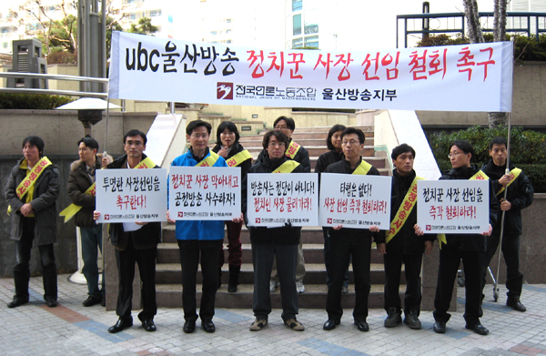 울산방송노조 김한주 위원장은 “이 달 21일 사령장을 받은 박원훈 사장은 방송계와 정치권을 철새처럼 오간 사람”이라며 “이는 대선을 앞두고 방송의 공공성과 중립성을 해칠 수 있는 중대한 요인”이라고 말했다.