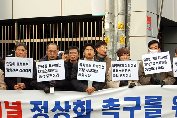 노조 집행부는 기자회견에 앞서 이날 오후 심상기 회장과의 면담을 요청해 놓았으나 심 회장이 참석여부를 밝히지 않은 채 서울문화사 건물을 빠져나가 면담이 좌절됐다.