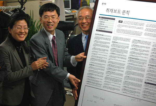▲ 29일 열린 한겨레 취재보도준칙 선포식에서 준칙으로 만든 패널에 참석자들이 서명한 뒤 활짝 웃고 있다. 사진 왼쪽부터 이지은 기자(정치부), 오귀환 편집국장, 김효순 편집인. |
