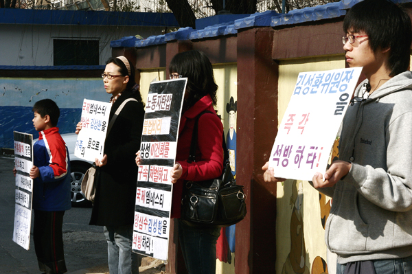 김성환 위원장의 부인, 아니 지금은 동지라는 표현이 더 적당할 것 같다. 임경옥씨는 12일 세 아이와 영등포교도소 앞에서 피켓 시위에 나섰다. 교도소측이 김 위원장의 귀휴를 불허했기 때문이다.