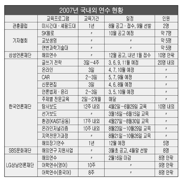 주제별 전문교육은 △엑셀교육(사이버)(3월1~30일) △교육제도(3월8~9일) △선거보도(3월29~30일) △국가예산·정책결정(4월26~27일) △카메라기자(5월11~12일) △파생금융상품보도(5월17~18일) △문화산업(6월7~8일) △사진기자(7월20~21일) △위험지역 취재(9월5~7일) △실전취재영어(10월1~11월30일)△재판·소송보도(10월17~19일) 등의 과정이 마련됐다.