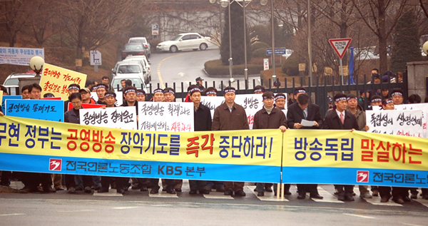 ▲ 언론노조, KBS.EBS노조 조합원들이 7일 기획예산처 앞에서 '공공기관운영에관한법률' 개정을 요구하며 시위하고 있다. |