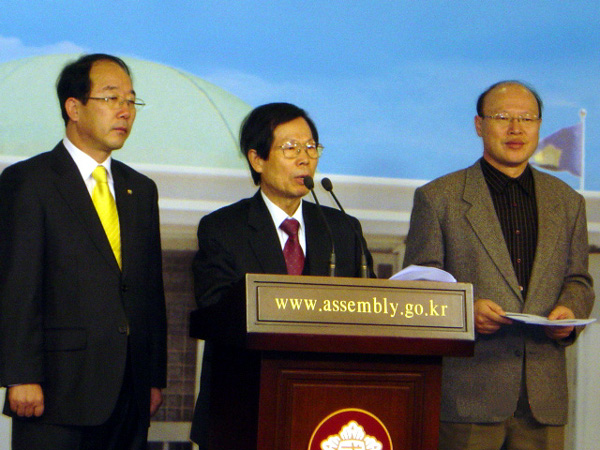 ▲ 언론탄압진상규명협의회가 14일 특별법 입법청원과 관련 국회에서 기자회견을 하고 있다. 왼쪽부터 열린우리당 이광철 의원, 동아투위 정동익 위원장, 정일용 한국기자협회장. 사진제공=언론개혁시민연대 |