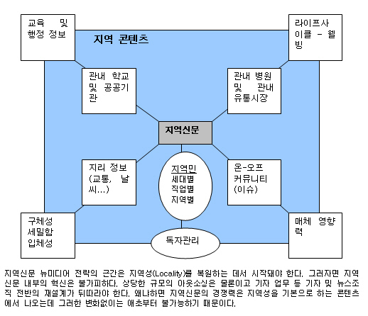 지역신문이 새로운 혁신 프로그램들을 진행하기 위해서는 이와 같은 산업적, 지역적 토대를 감안해야 한다. 기본적으로는 '지역성(Locality)'에 근간을 두고 독자(CRM, Community), 데이터베이스(지역정보), 콘텐츠의 업그레이드를 추구해야 할 것이다.