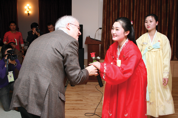 금강산옥류관에서 열린 만찬에서 북측 접대원이 에이든 화이트 IFJ사무총장에게 꽃을 전달하자 화이트 사무총장은 환한 미소로 인사를 하고 있다.