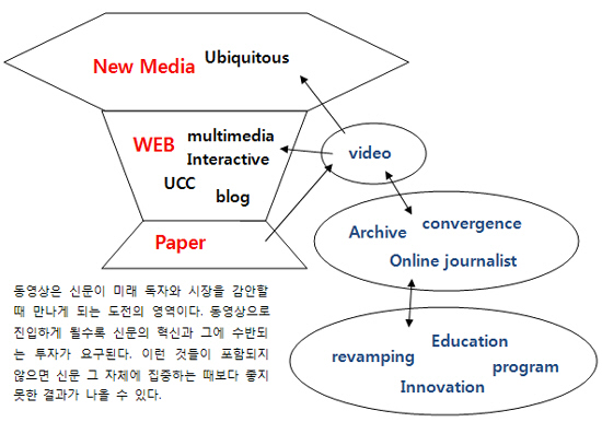 현장 그림이라도 찍어서 올리자는 메아리는 솔직하다. 솔직하다못해 비참하다. 동영상 콘텐츠를 제대로 하기 위해서는 기자들이 변해야 한다. 세계적인 신문 기업들은 온라인과 오프라인 뉴스조직의 비중을 50:50으로 가고 있다. 신문의 경쟁상대는 신문이 아니라 지식대중이며 무수한 미디어 채널(window)이다.