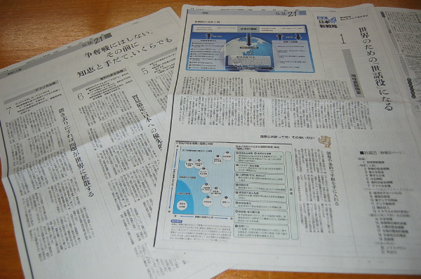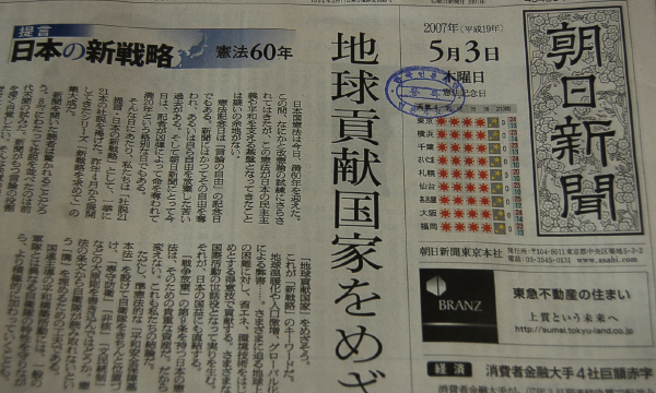 아사히는 사설에서 “신전략의 키워드는 ‘지구 공헌 국가를 목표로 하자’는 것으로 지구온난화나 인구급증, 글로벌화에 대한 폐해를 에너지 절약, 환경기술 개발 등 국제 활동을 통해 일본 국익에 직결토록 해야 한다”며 “일본 헌법 9조 역시 공헌을 위한 귀중한 자산이기에 바꾸지 말아야 한다는 게 우리의 결론”이라고 전했다.