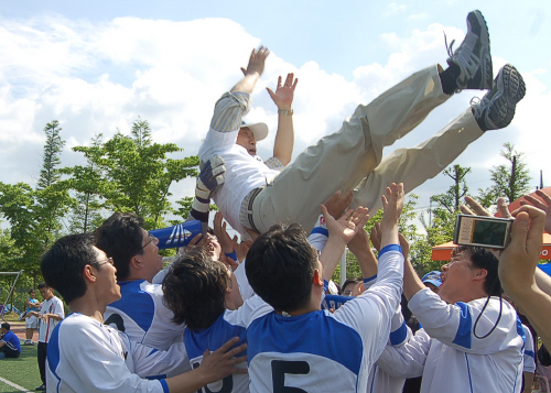 | ▲ 서울지역 기협축구대회에서 우승한 YTN 선수들이 표완수 사장을 헹가래치고 있다. | ||