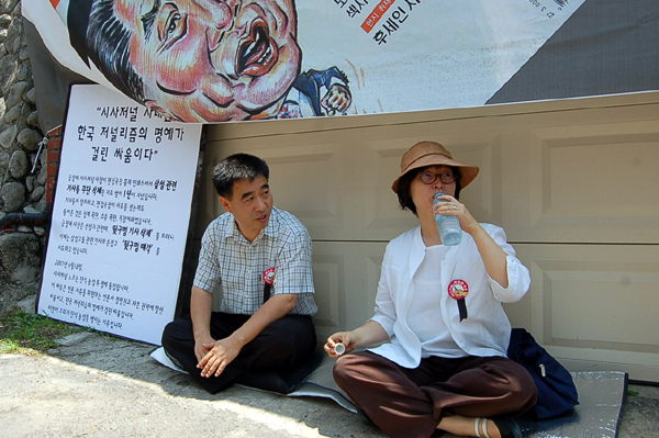 ▲ 정희상 위원장과 김은남 사무국장은 이날 시사저널 심상기 회장 자택 앞에서 무기한 단식농성에 돌입했다. |