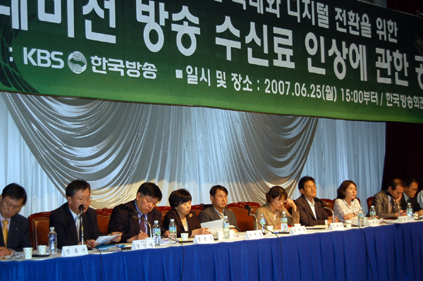 25일 목동 방송회관 기자회견장에서 열린 ‘수신료 인상에 관한 공청회’에서 KBS 정연주 사장, 진홍순 특임본부장, 김서중 교수(성공회대), 유세경 교수(이화여대) 등은 3시간여 동안 열띤 토론을 벌였다.