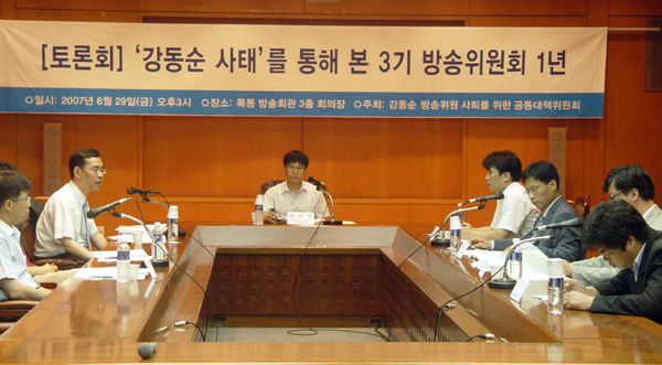 ‘강동순 녹취록 파문 90일간의 기록’이라는 주제로 발제를 맡은 윤익한 언론개혁시민연대 방송정책 팀장은 강동순 방송위원이 버티기를 계속할 수 있는 이유가 열린우리당 진상조사 특위가 유명무실하며 한나라당이 ‘강동순 구하기’에 나섰기 때문이라고 주장했다. 또 ‘강동순 사태’에 대해 언론사들이 외면한 것과 언론노조 등 시민사회 내부의 지지부진도 한 몫을 했다고 덧붙였다.