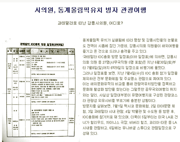 시의원들의 당시 행적은 지역주간지인 영동매거진 7일자 ‘시의원, 동계올림픽유치 빙자 관광여행’이라는 기사를 통해 세간에 알려졌다. (사진)