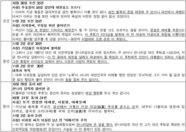 10월 29일부터 11월 3일까지 5개 일간지 기사의 주요 의제는 이회창 전 한나라당 총재의 출마설이라고 할 수 있다. 이에 대해 조선과 중앙, 동아는 사설 칼럼 등 의견기사를 동원하여 원색적인 비난을 퍼붓는다. 그 비난의 대표적인 사례를 살펴보자.