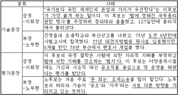 이와 같은 방식으로, 이후보를 긍정적으로 기술하고 있는 문장이 4건이었고, 노후보를 긍정적으로 기술하는 문장은 아예 한 건도 없다. 반면에 부정적으로 기술한 문장을 보면 노후보 경우 4건이 있었지만, 이후보 경우는 한 문장도 없었다. 따라서, ‘사실을 진술’하는 기술에 있어서 조선일보는 이 후보를 일방적으로 편들고 있는 것이다