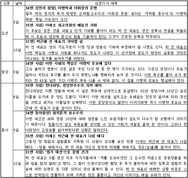 이명박-박근혜 화합이 살길, 훈수두기로 전환 한편, 이회창 후보가 출마 선언 기자회견을 가진 다음날인 8일부터 조선과 중앙, 동아의 논조는 다소 변화된 모습을 보인다. 이회창 후보의 출마에 체념한 듯, 9일부터는 본격적으로 향후 한나라당이 어떻게 해야 할지에 대해 훈수를 두는 태도를 보인다. 아래의 <표4>에서 나타나는 것처럼, 마치 ‘한나라당의 기관지’를 자처한 듯 이명박 후보의 사태 수습을 촉구하는가 하면, 박근혜 후보의 이명박 후보 지원을 요구한다.