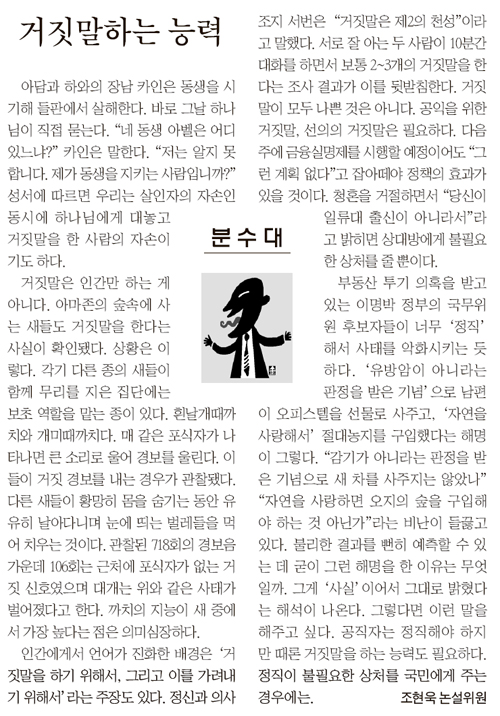 ▲ 중앙일보 27일자 35면에 오른 조현욱 논설위원의 분수대 [거짓말하는 능력] 기사 |