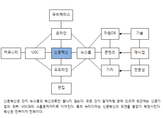 신문만 변화시켜서는 안된다는 점은 BBC의 ‘방송을 넘어서’ 전략, 가디언지의 ‘온라인 지적 커뮤니티’ 전략에서처럼 혁신의 외연이 무한대로 뻗쳐진 성공적 사례들로 증명된다.
