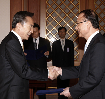 ▲ 이명박 대통령이 26일 오후 청와대에서 신임 최시중 방송통신위원장에게 임명장을 수여한뒤 악수하고 있다. (=연합) |