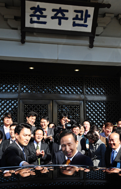 ▲ 이명박 대통령이 지난 2월 처음으로 청와대 춘추관을 방문해 기자들을 격려한 후 차량에 탑승하고 있다. (=뉴시스) |